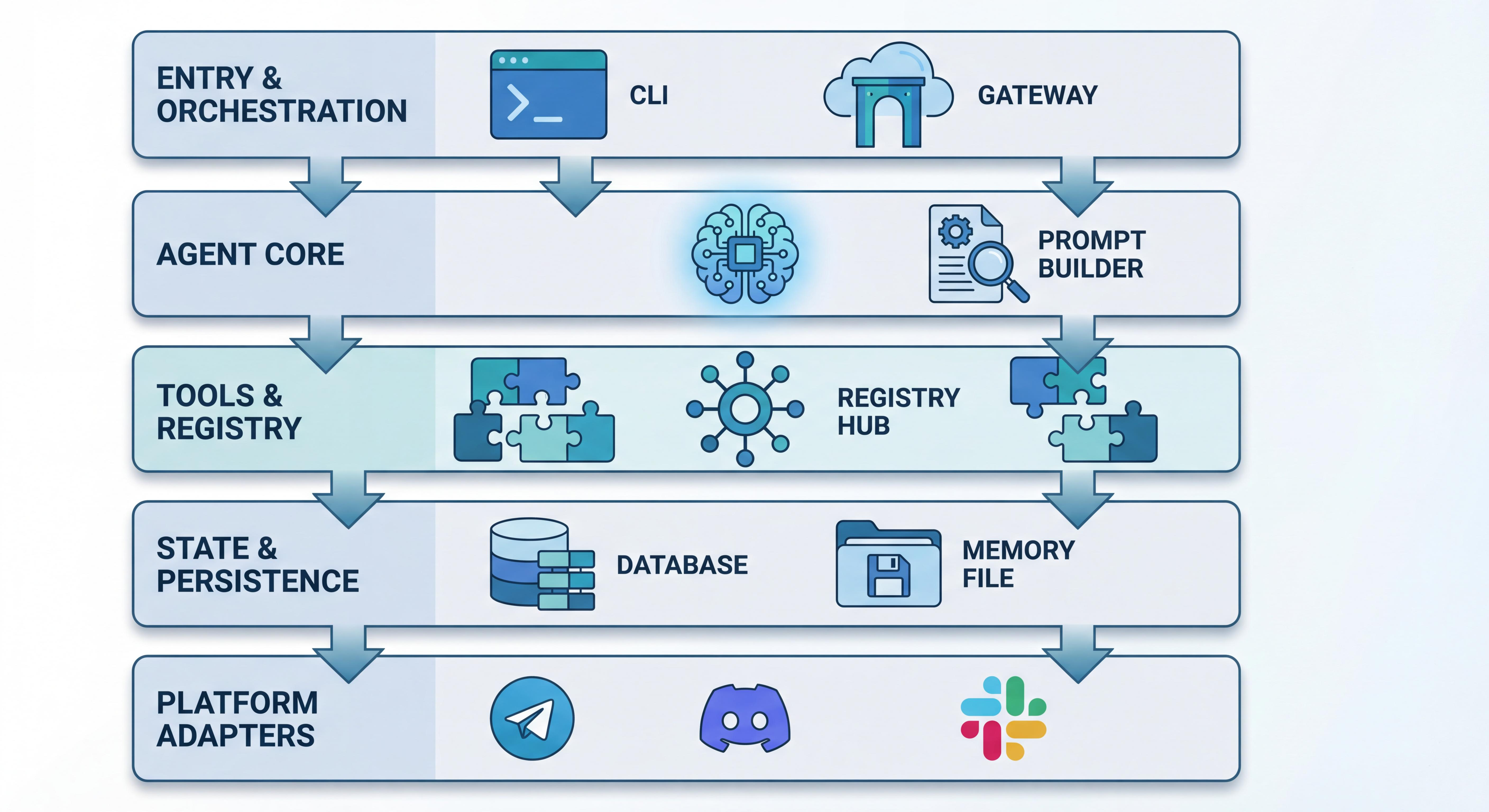 从源码目录结构和模块依赖链来看,Hermes Agent 的架构可以抽象为五个层次:
